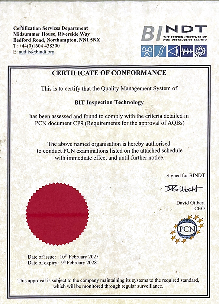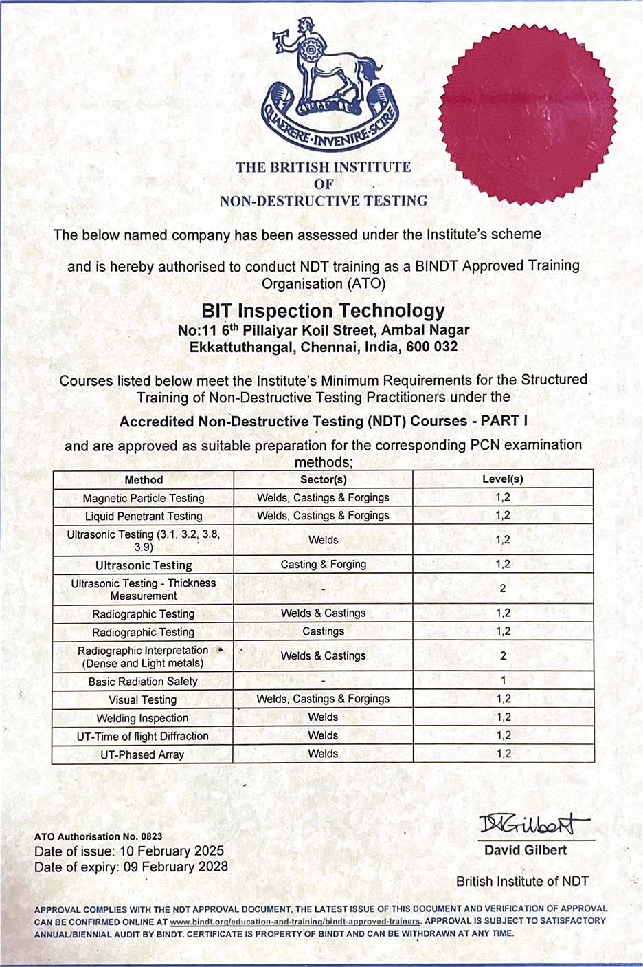 BIT Inspection technology is approved by BINDT for conducting Level 1, 2 & 3 courses in the following methods,